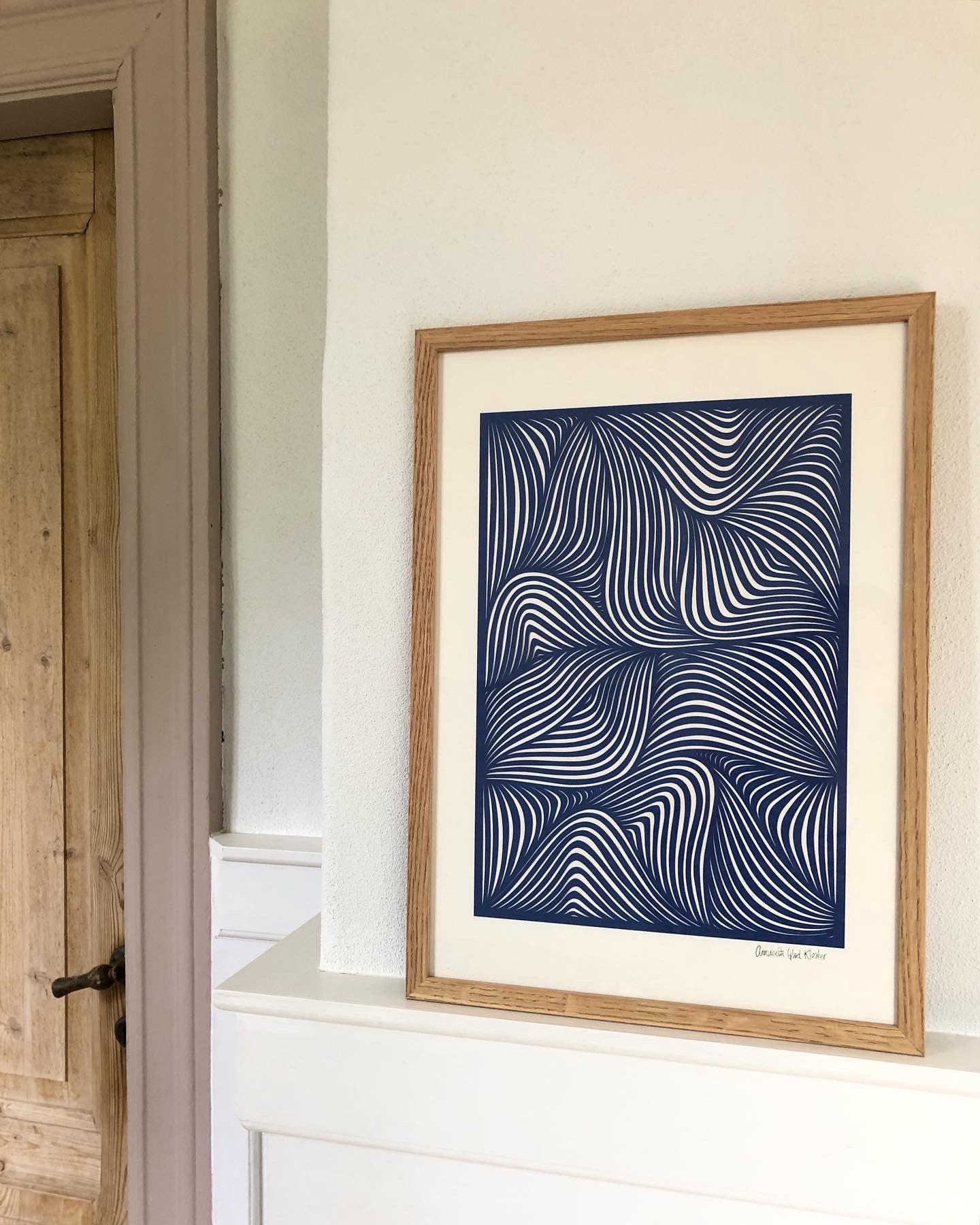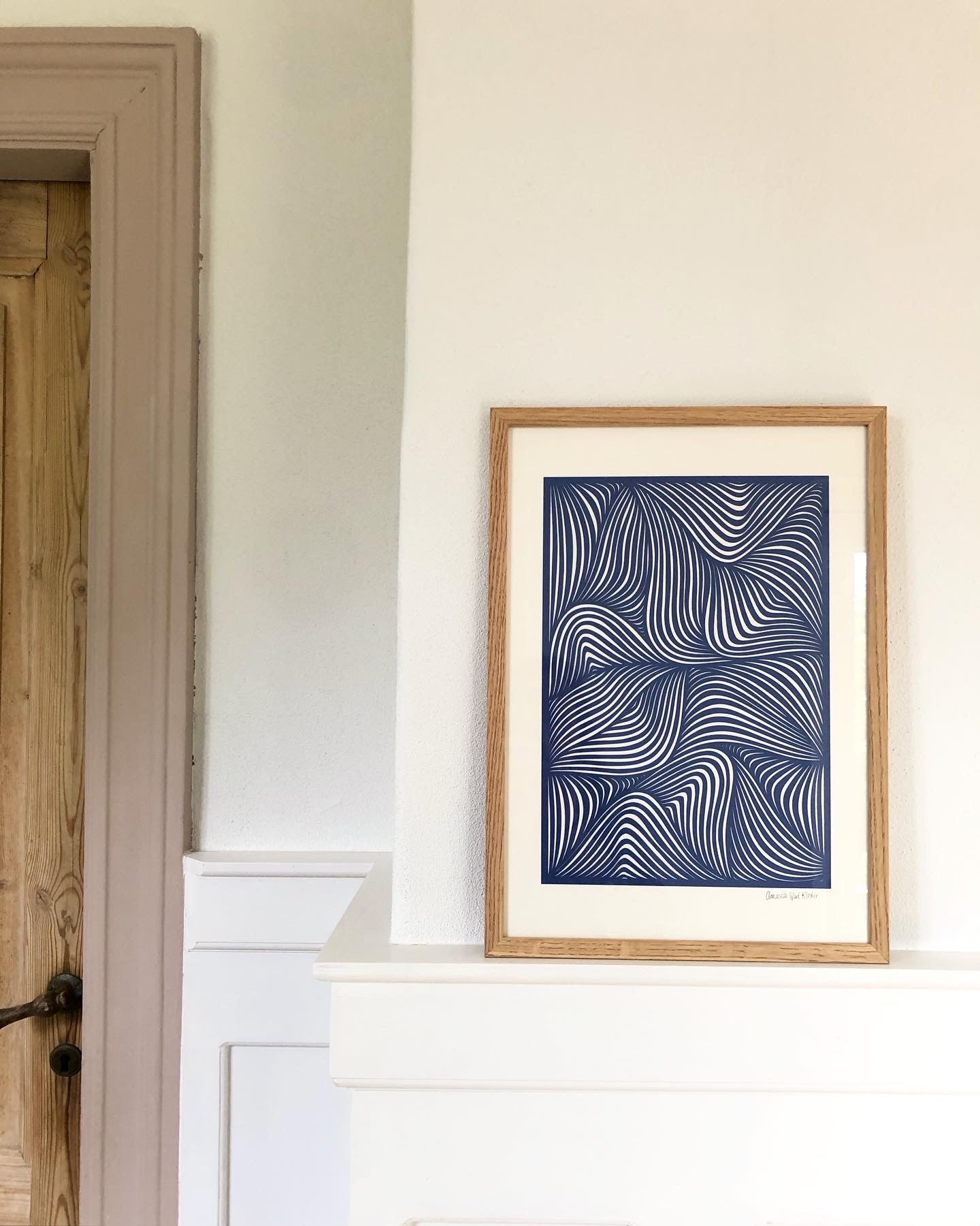 Håndskåret unika papercut i blåt på baggrund i knækket hvid, str. A3 (29,7x42cm).