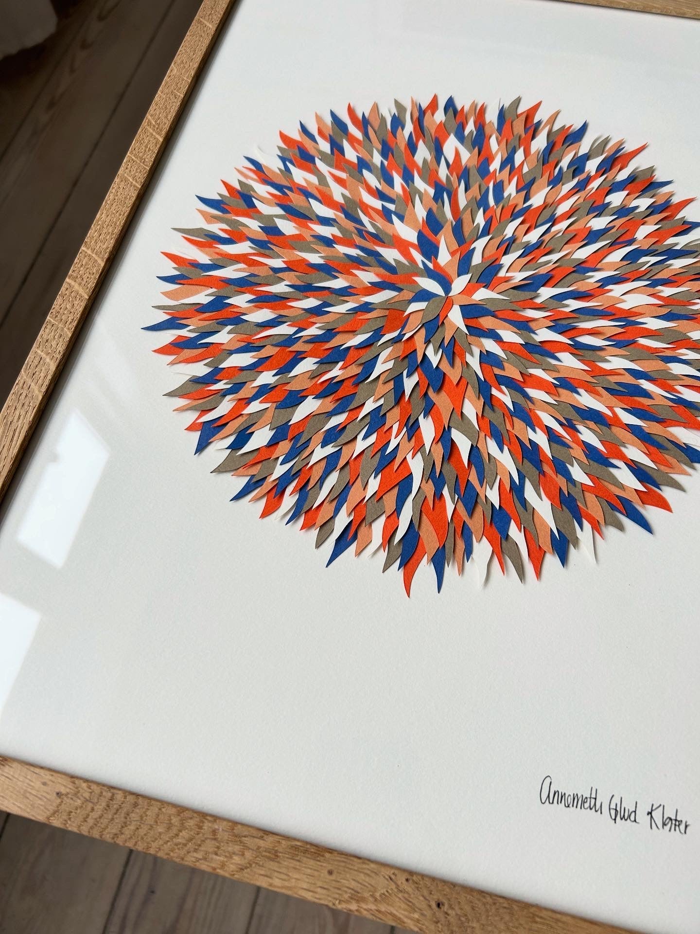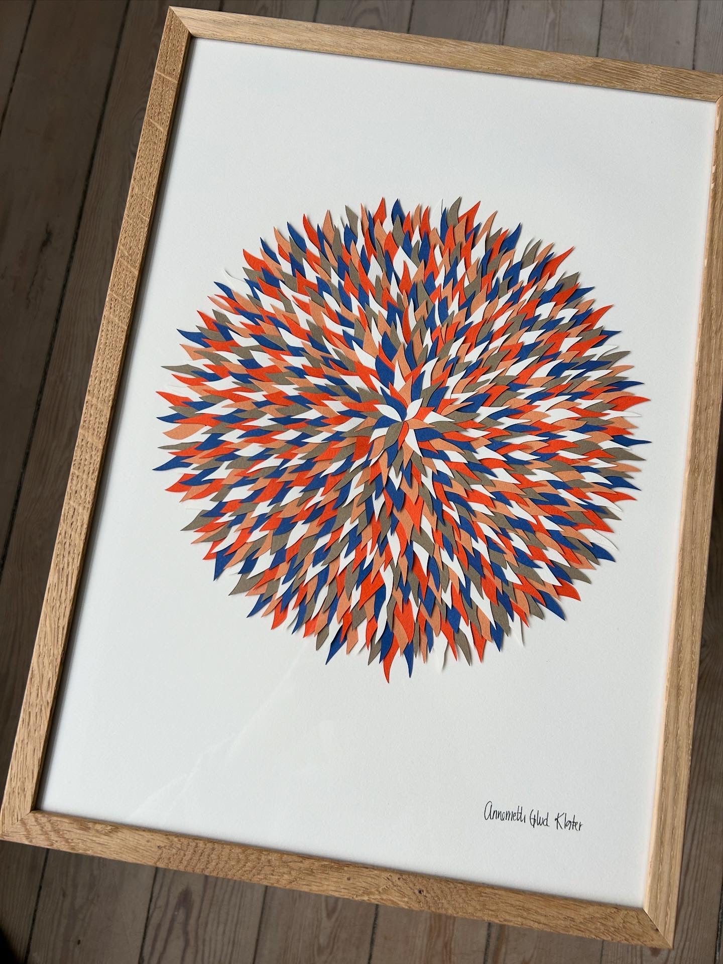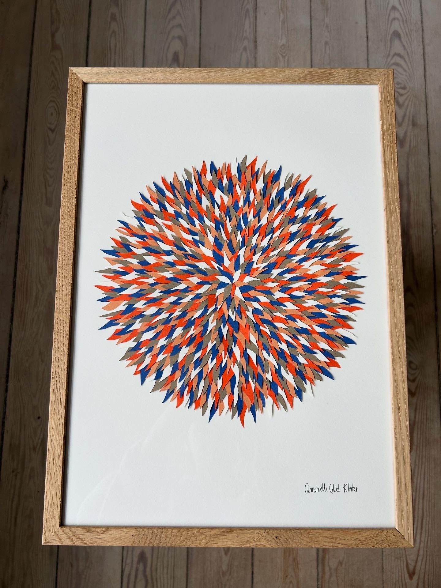Collage lavet af de fine små udskæringer, der er tilovers fra papercuts - i farverne blå, khakibrun, orange, nude, elfenben og knækket hvid, A3 (29,7x42).