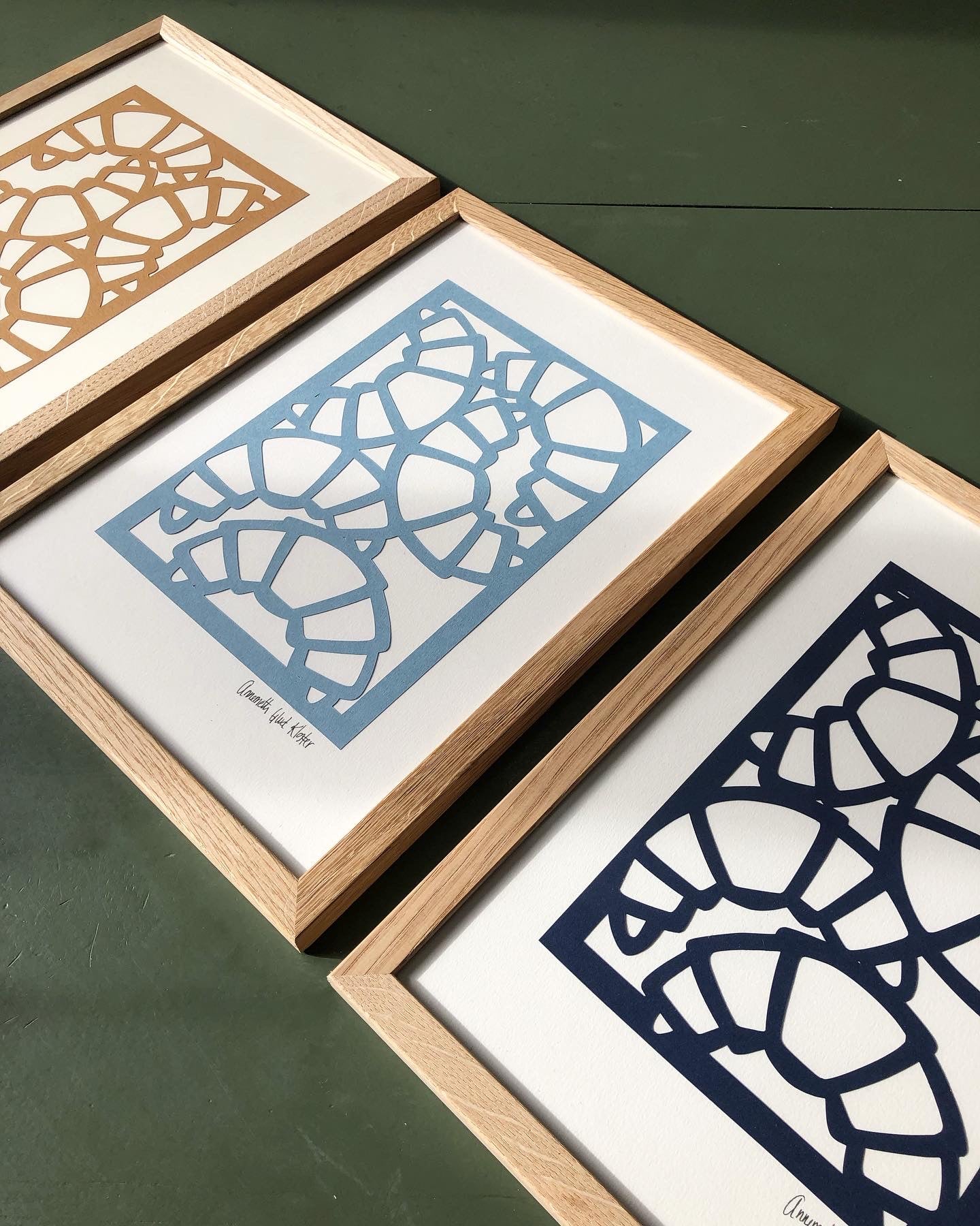 Croissanter i støvet blå på knækket hvid baggrund i A4 (21x29,7cm.).