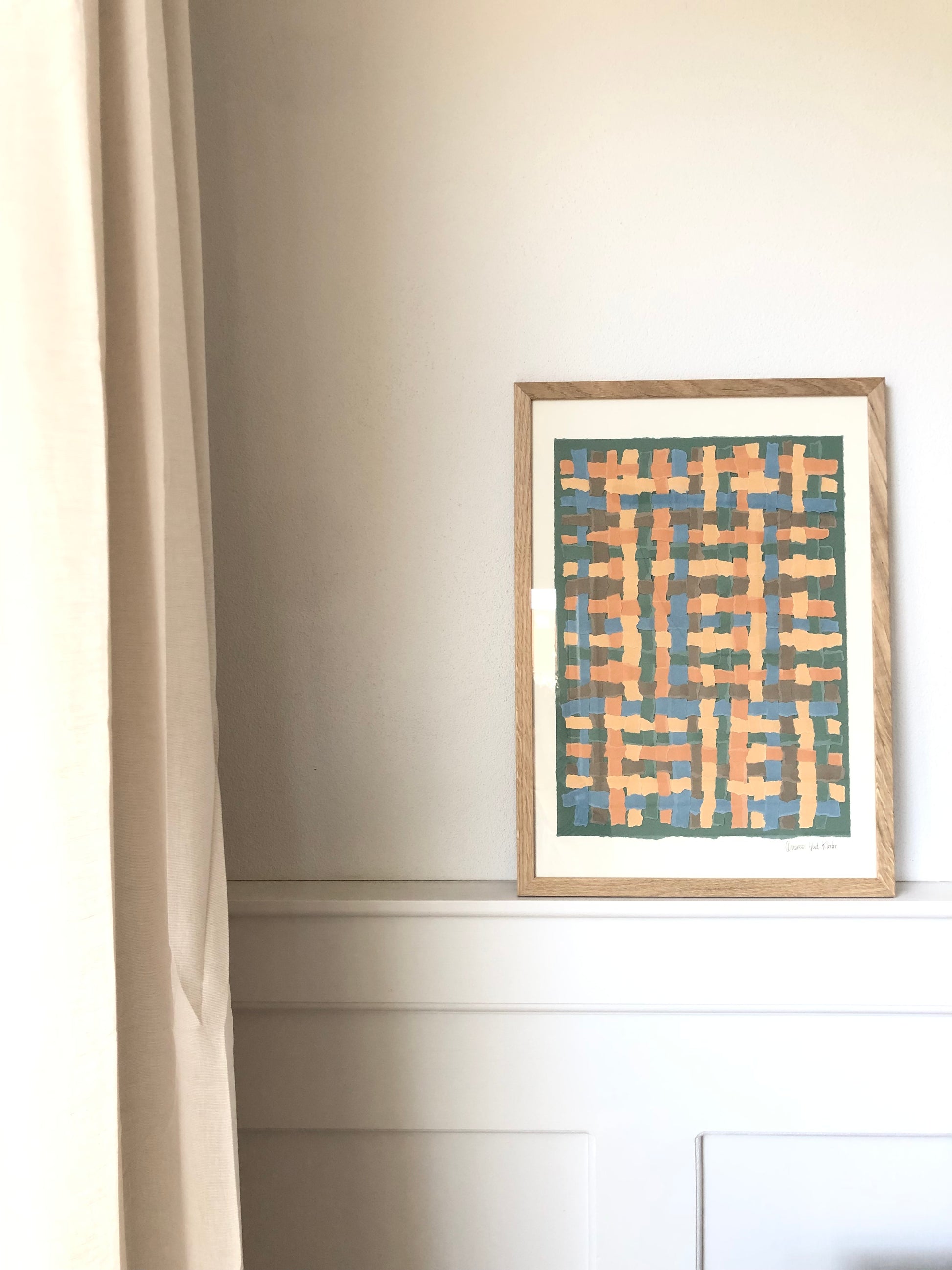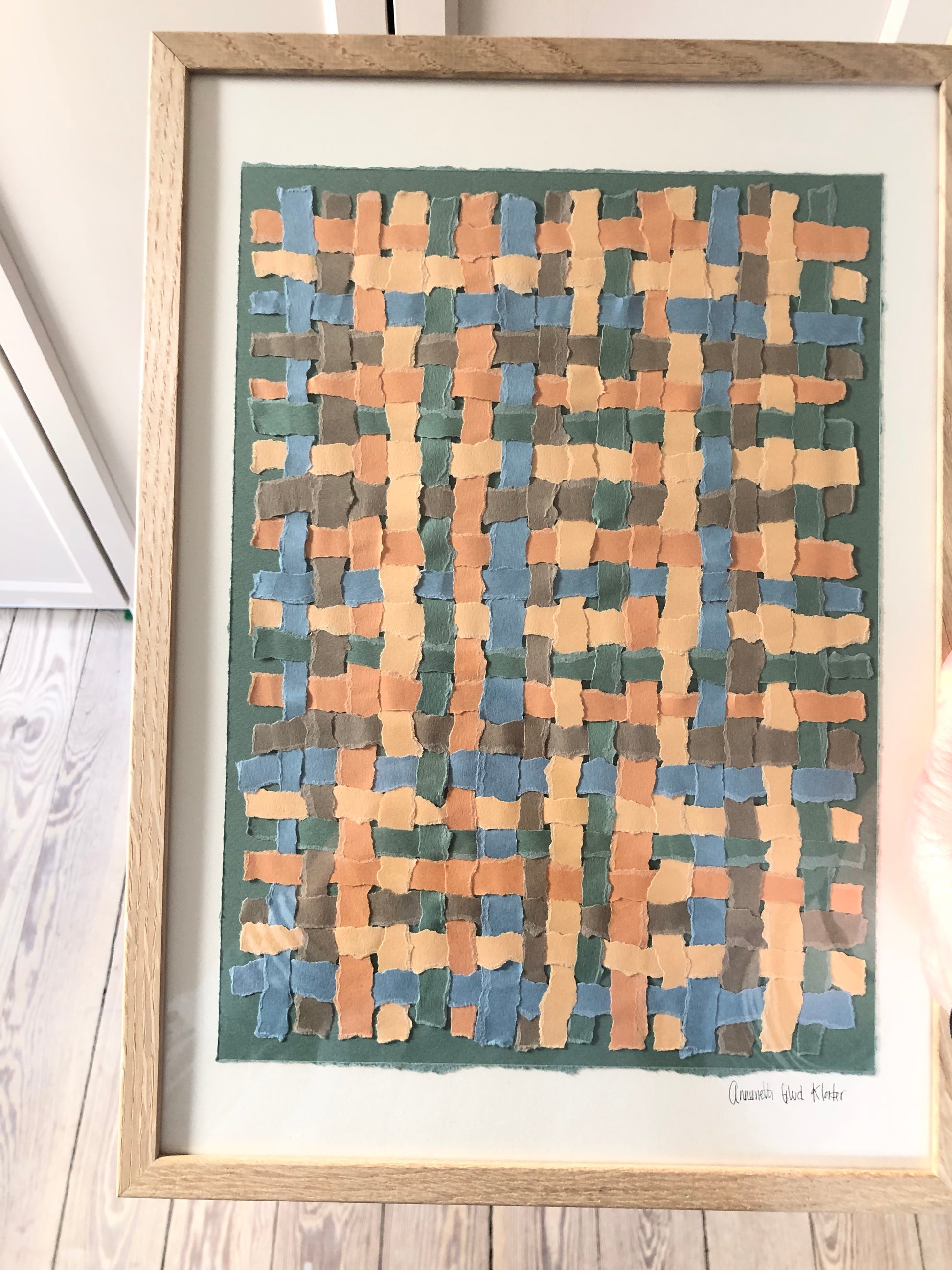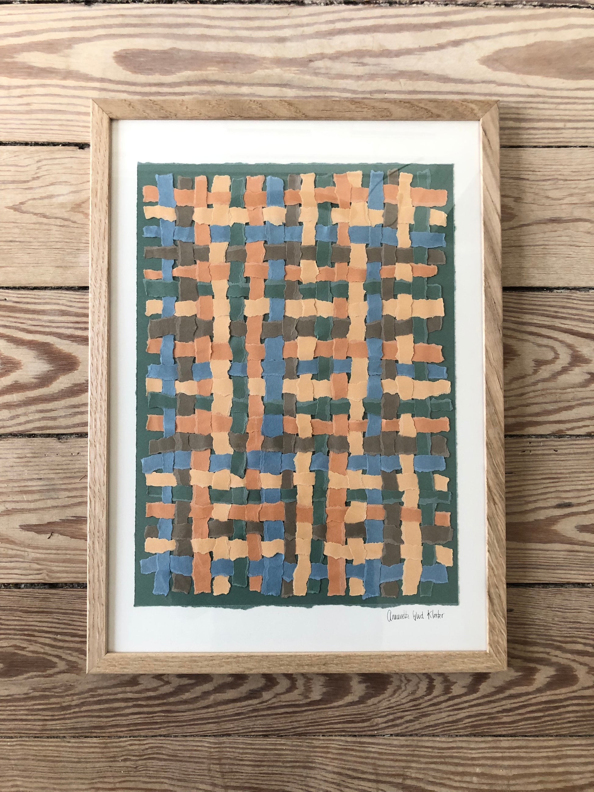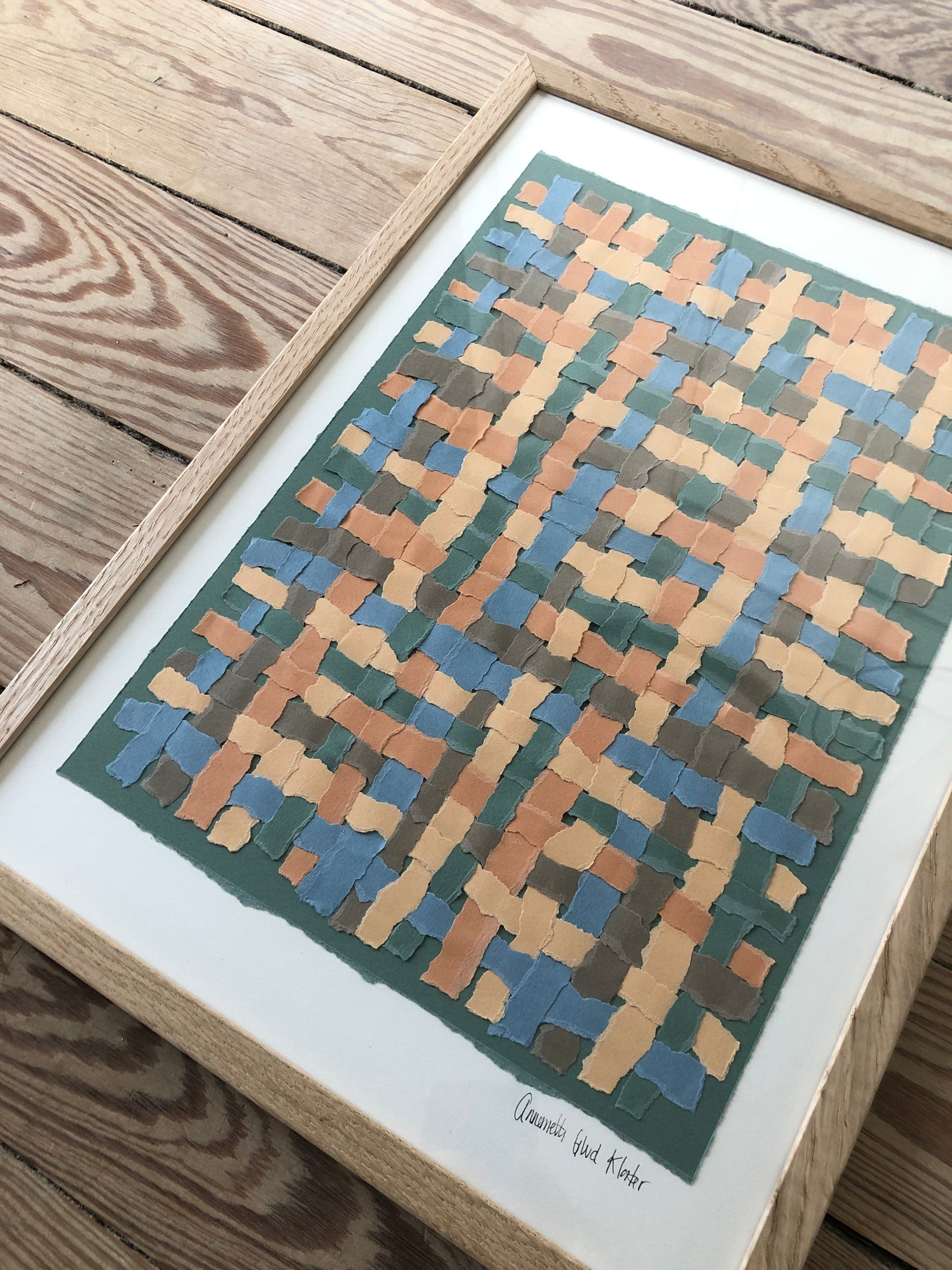 Flettet papir-collage i forskellige farver på baggrund i knækket hvid, str. A3 (29,7x42cm).