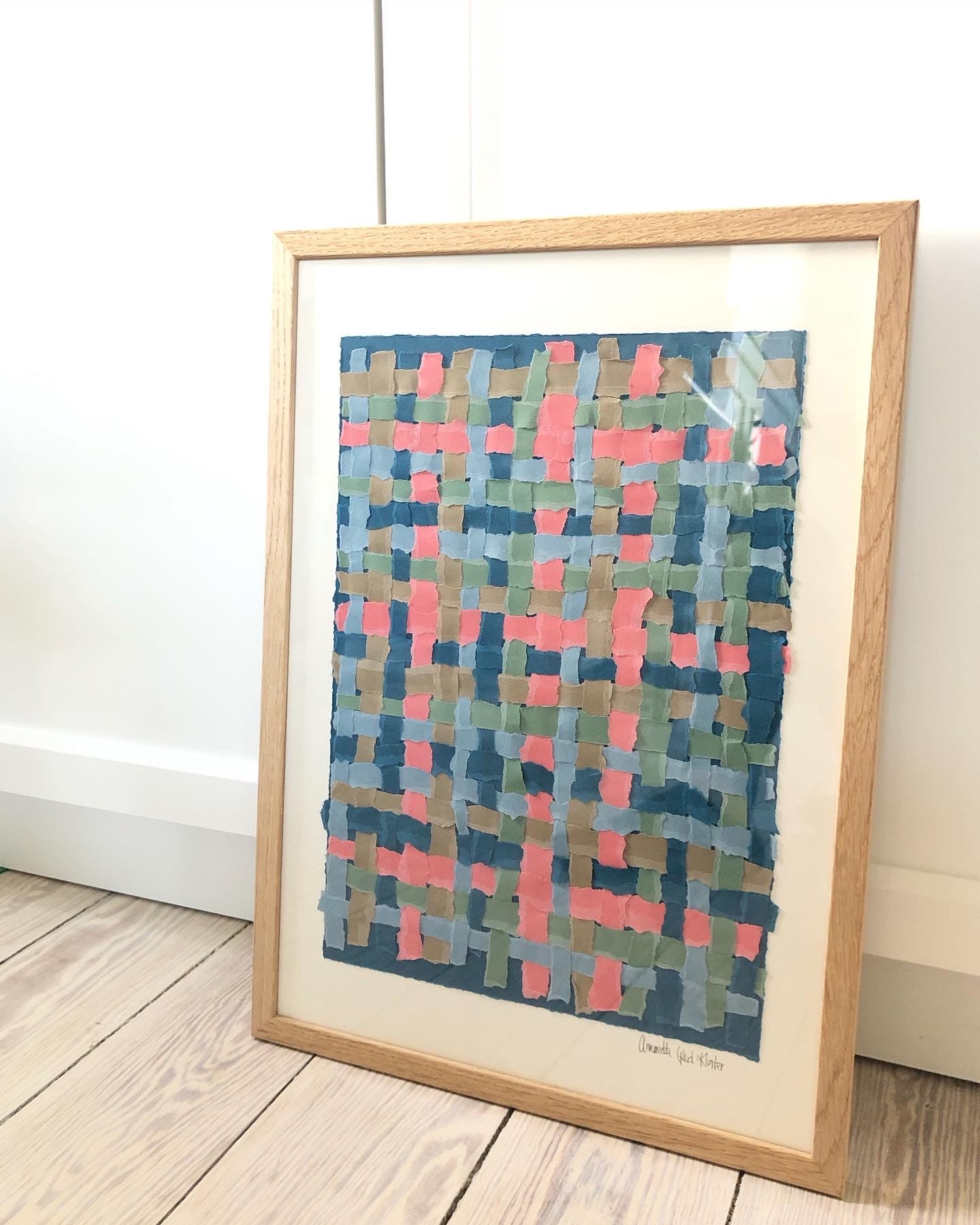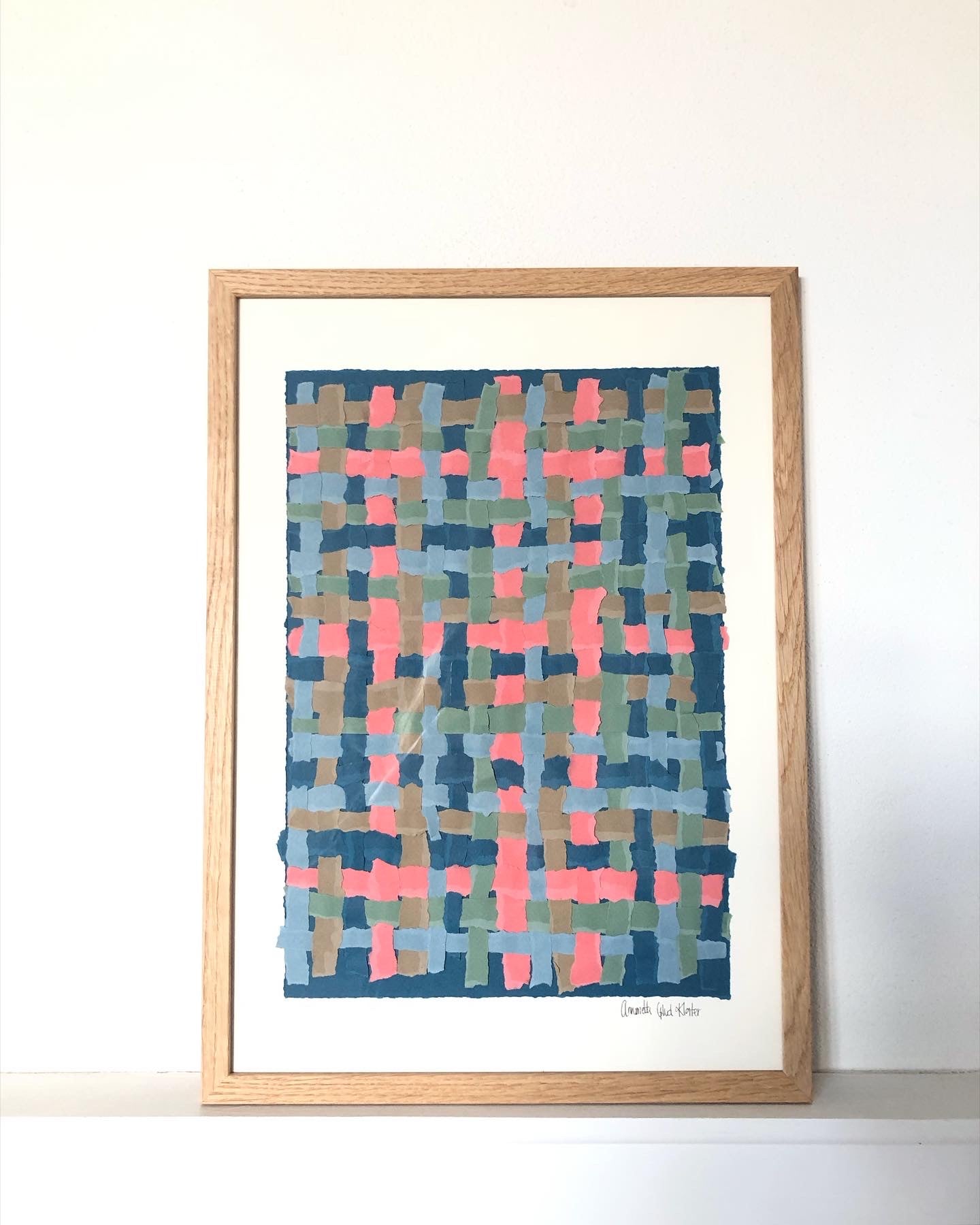 Flettet papir-collage i forskellige lækre farver på baggrund i knækket hvid, str. A3 (29,7x42cm).