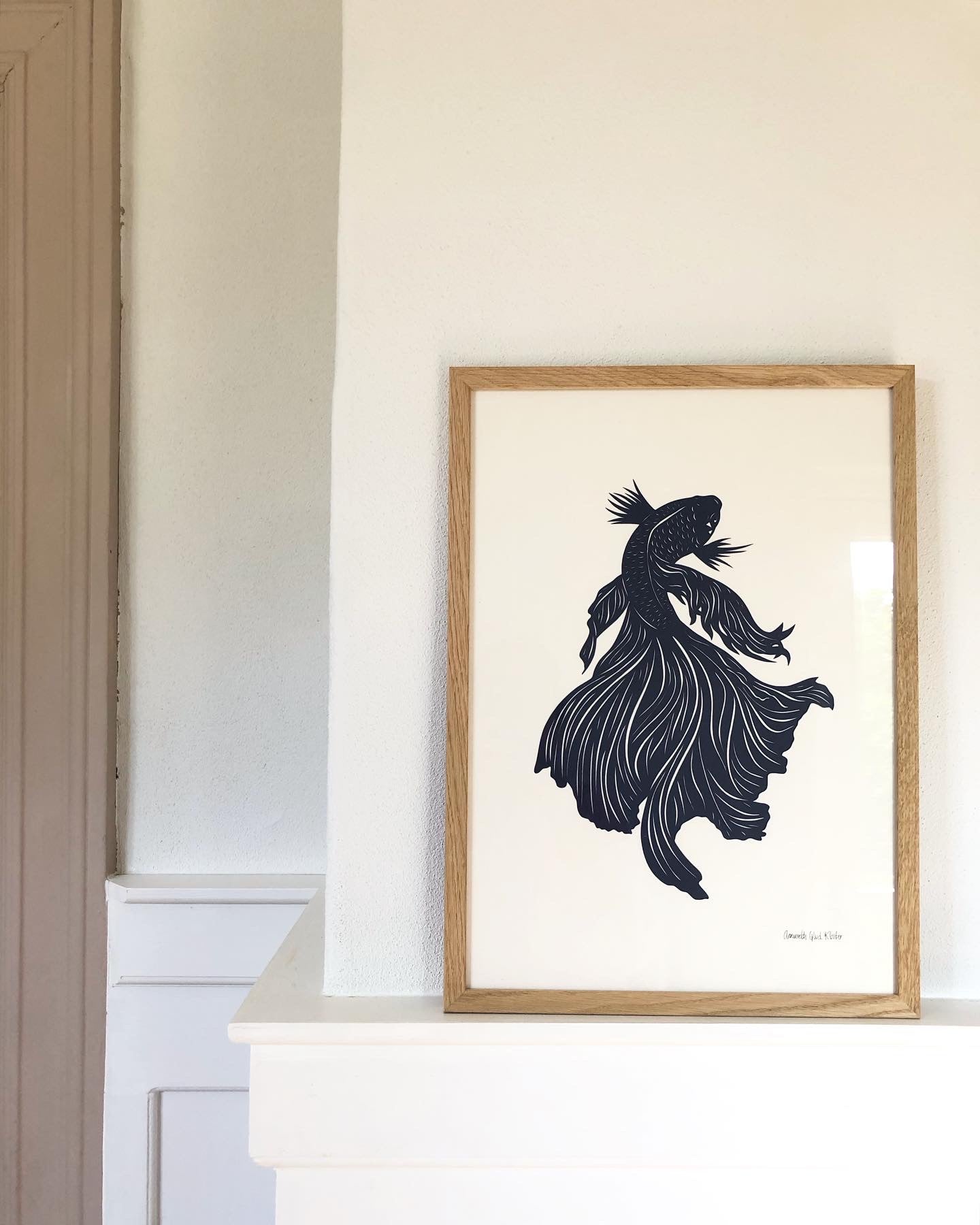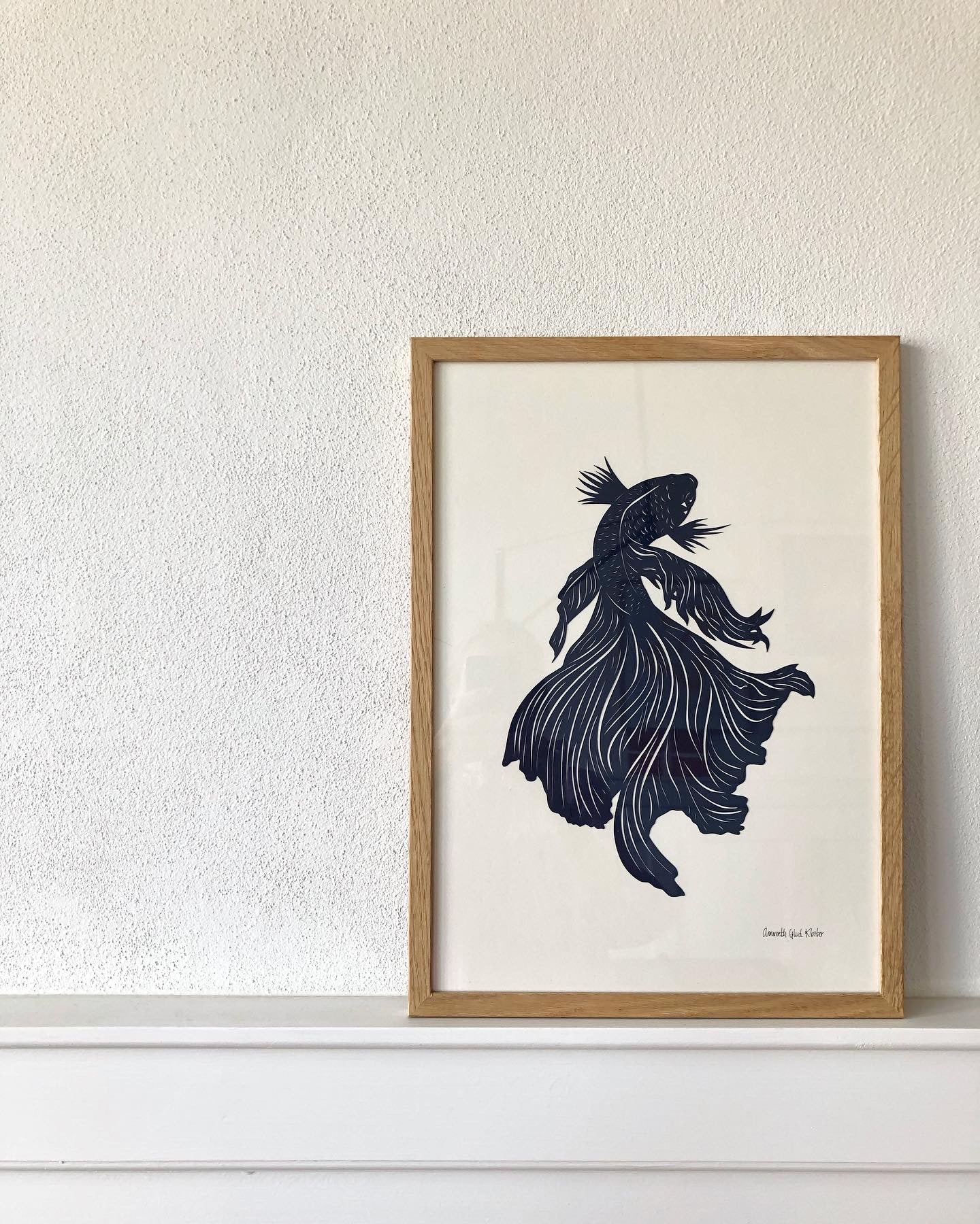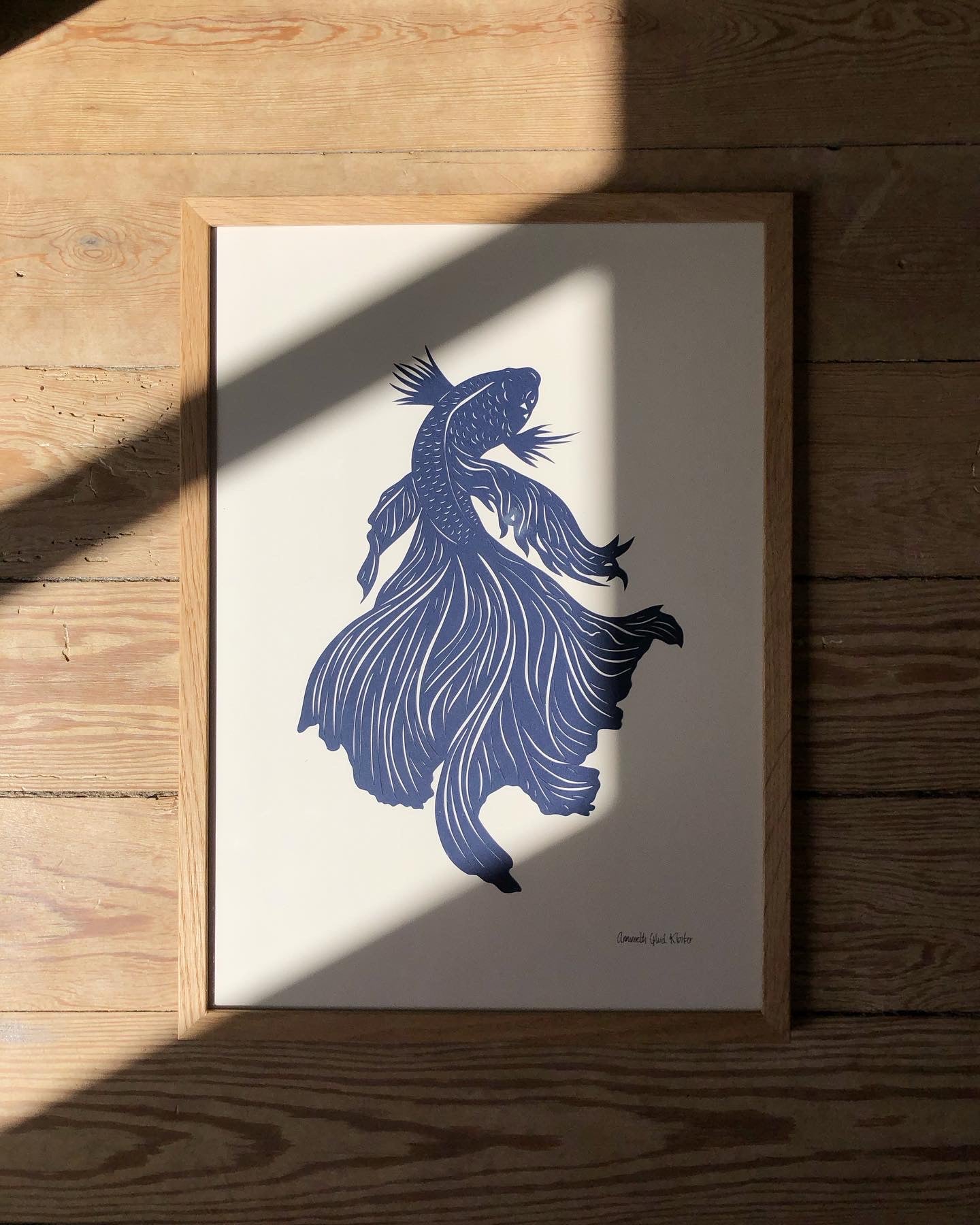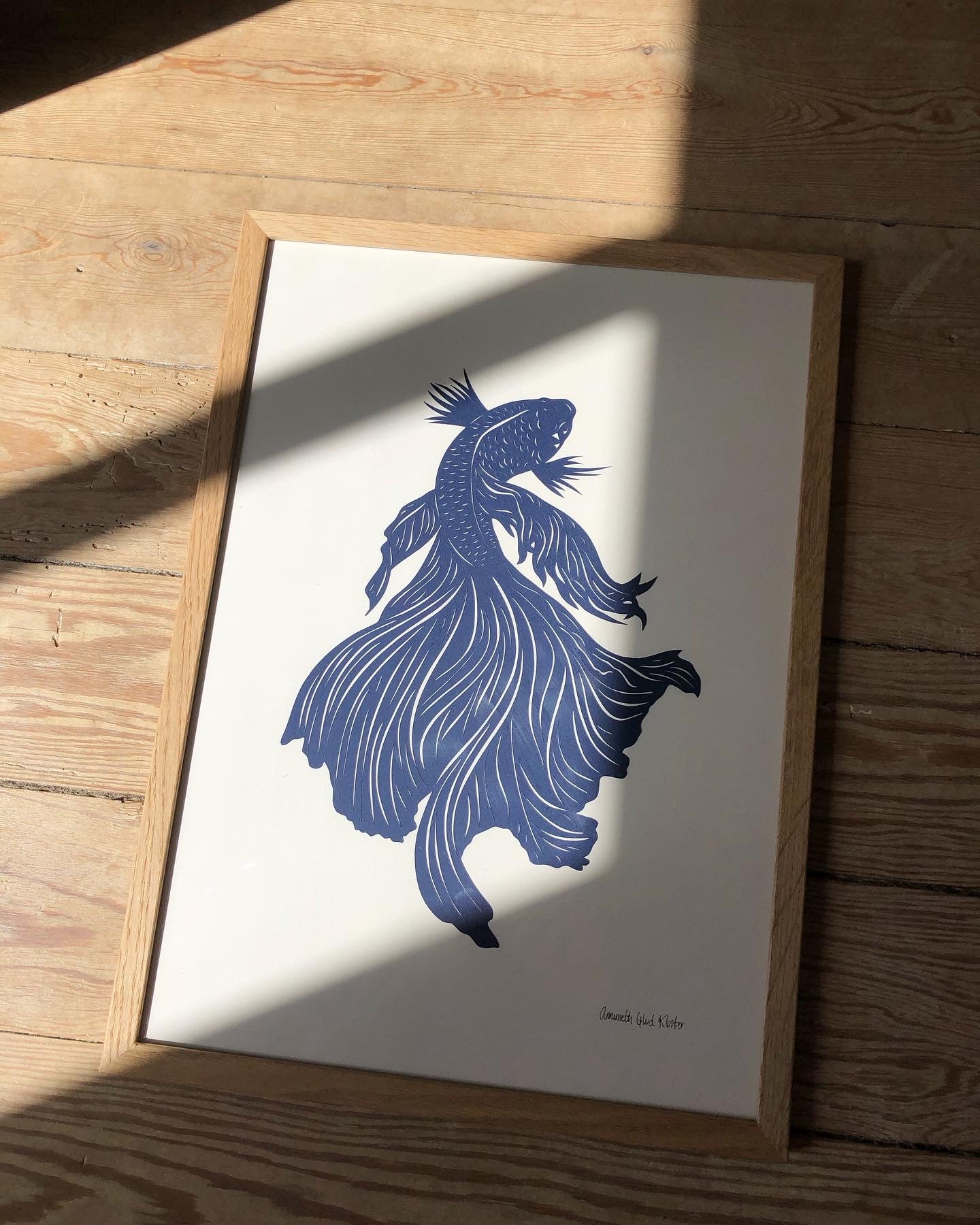 Mørk marineblå fisk på baggrund i knækket hvid i str. A3 (29,7x42cm).