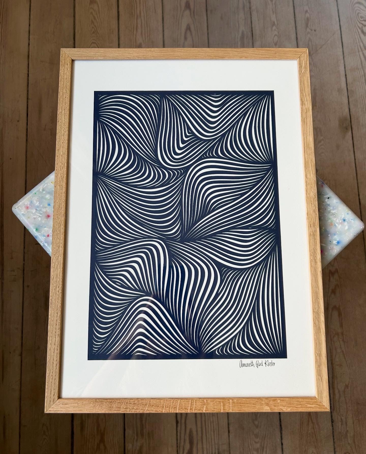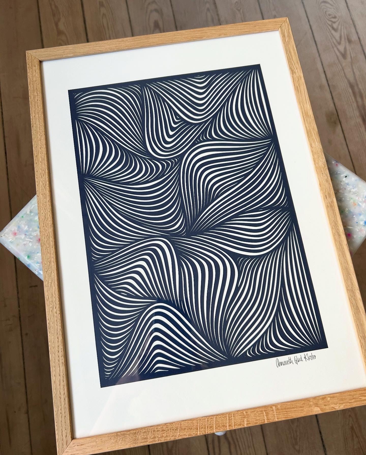 Håndskåret unika papercut i marineblå på baggrund i knækket hvid, str. A3 (29,7x42cm).