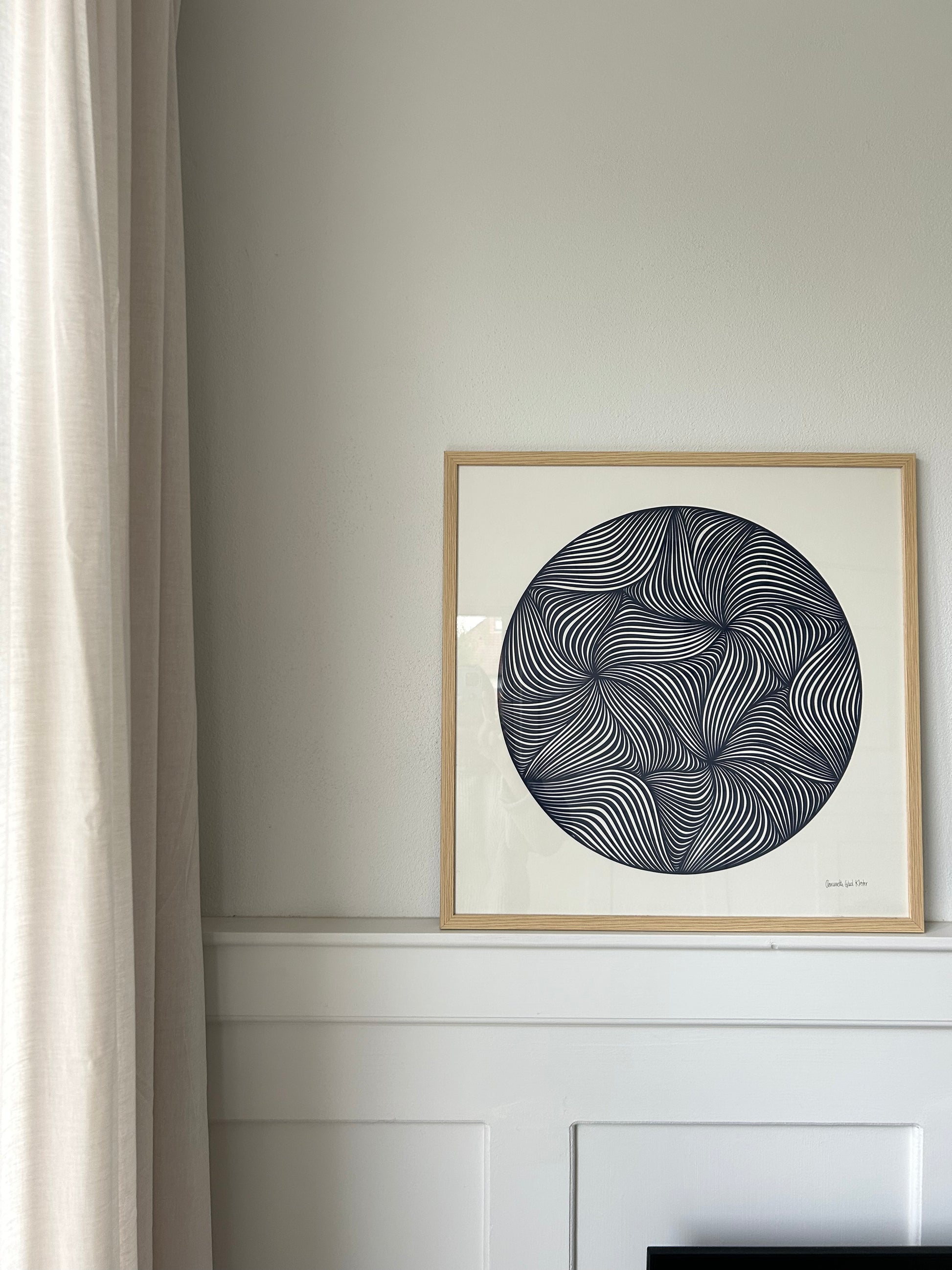 Rundt marineblåt klip på knækket hvid baggrund, 50x50cm.