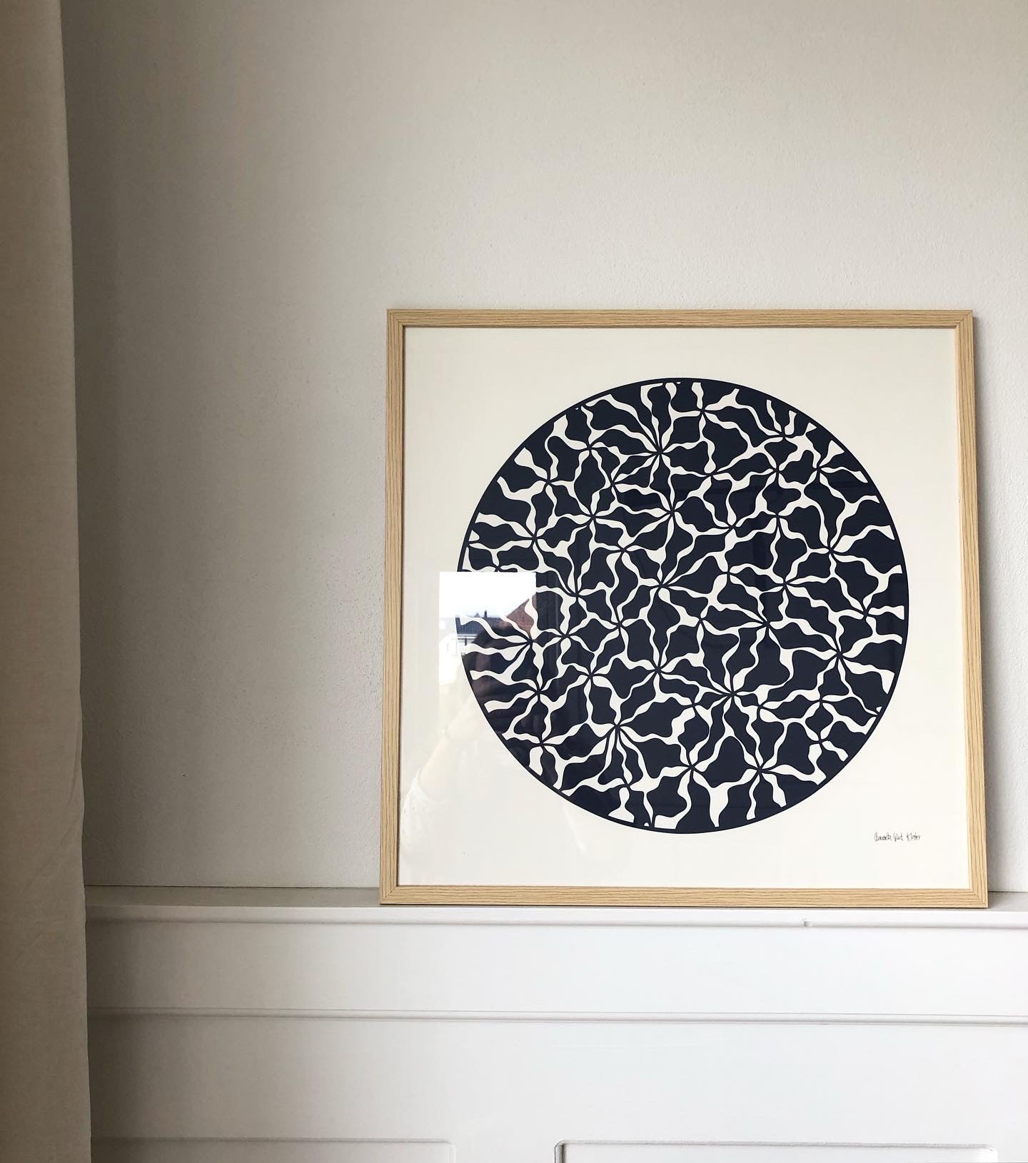 Rundt organisk marineblåt klip på knækket hvid baggrund, 50x50cm.