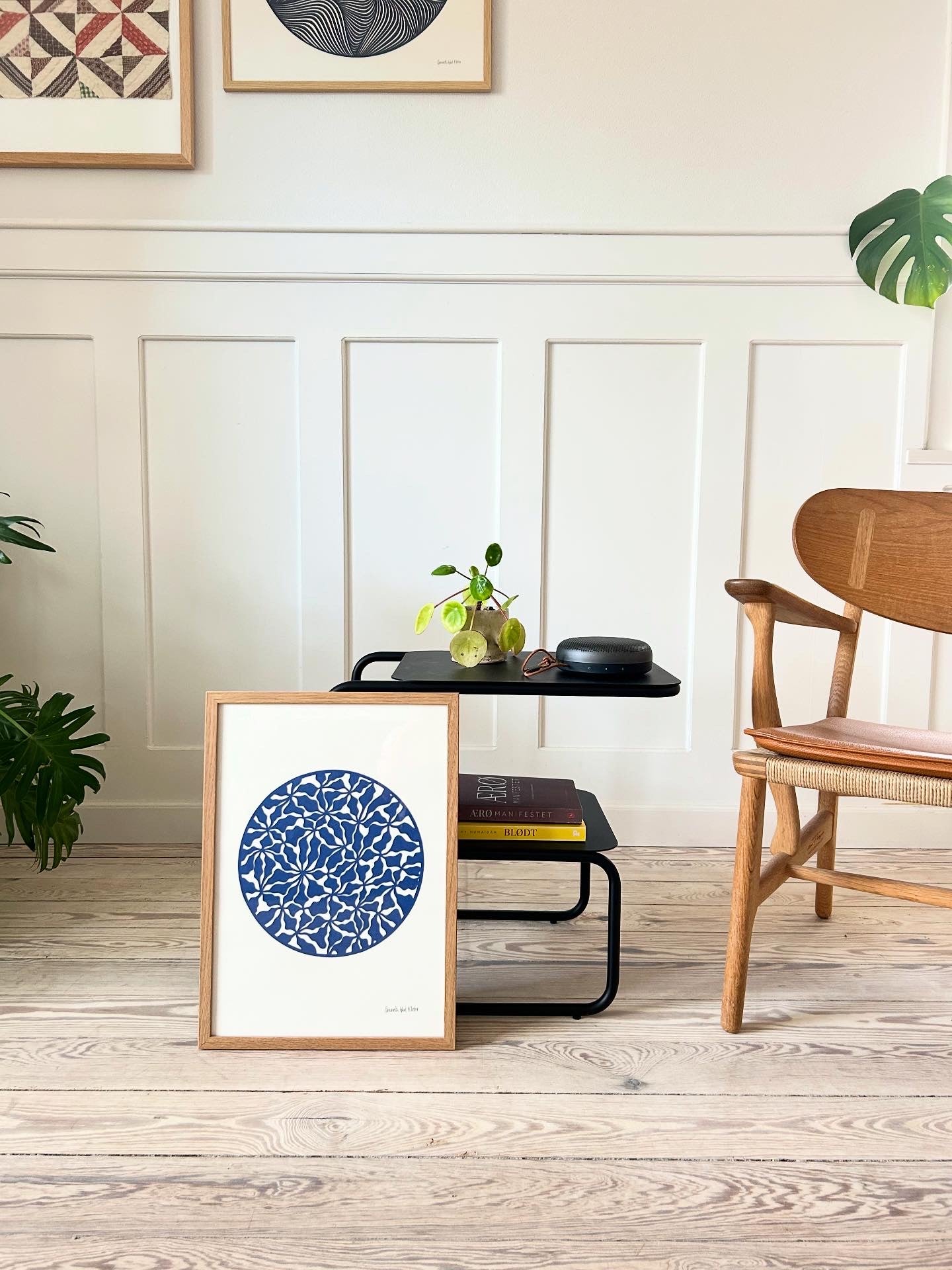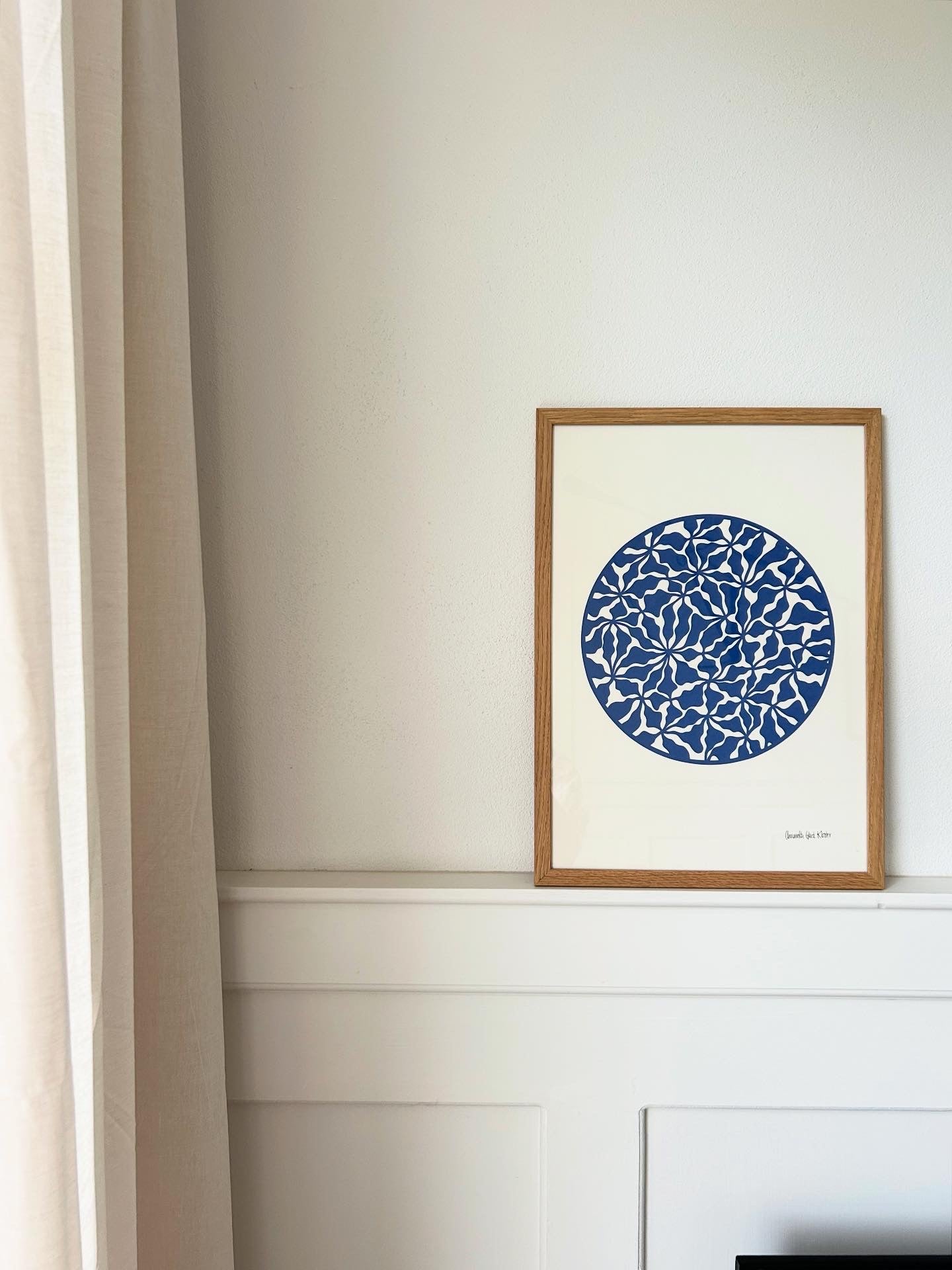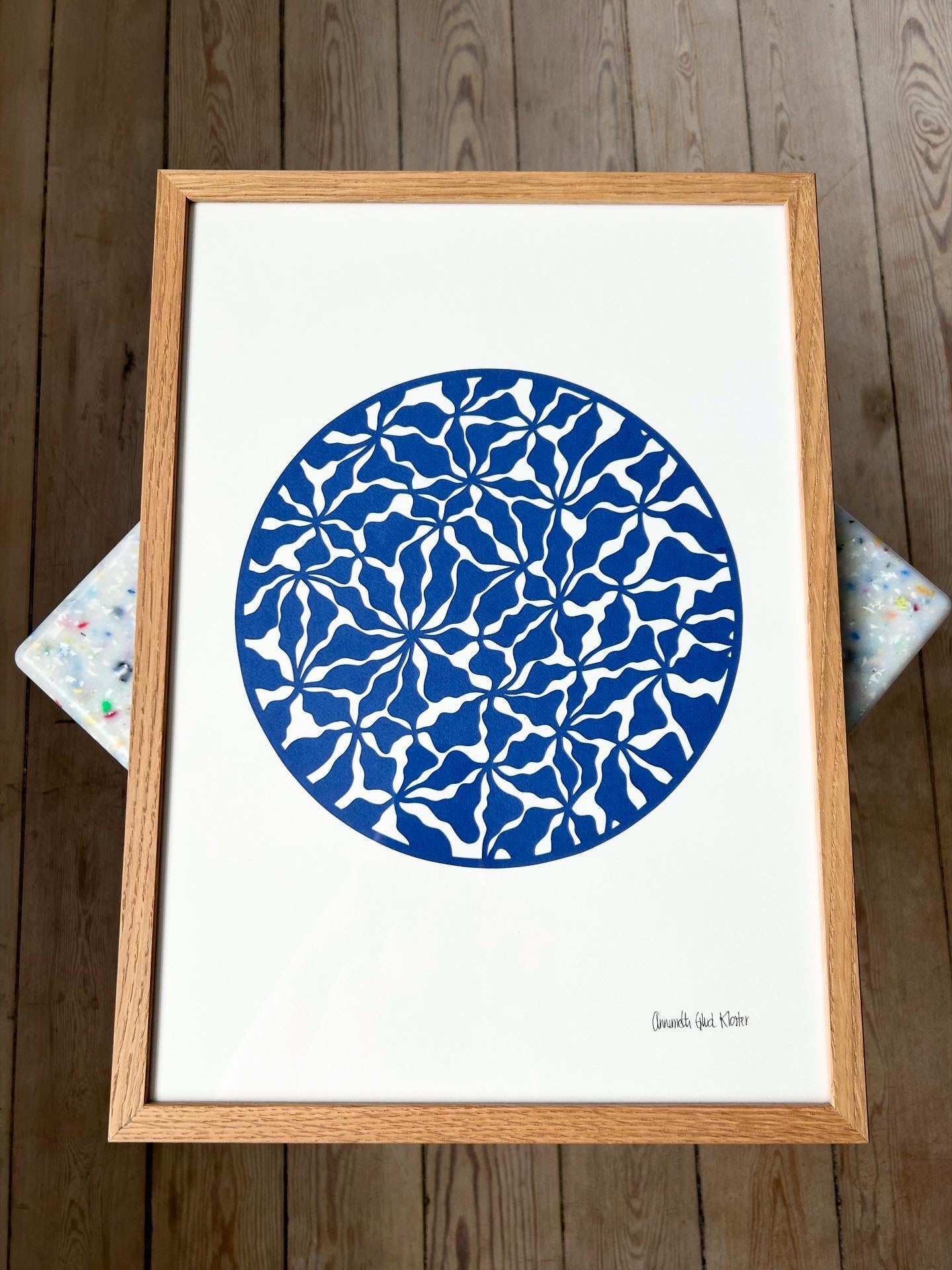 Organisk udskæring i blå på knækket hvid baggrund i A3 (29,7x42cm).