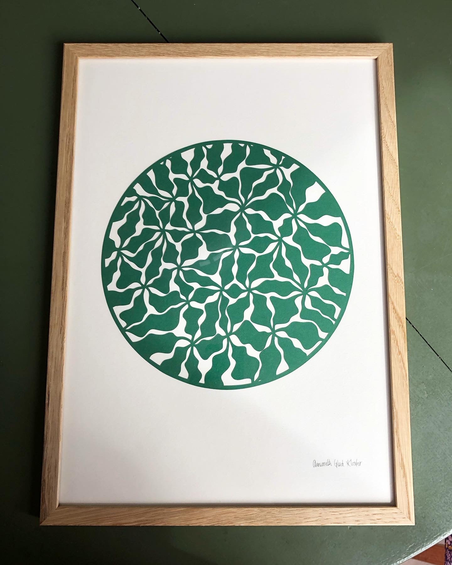 Organisk udskæring i grøn på knækket hvid baggrund i A3 (29,7x42cm).