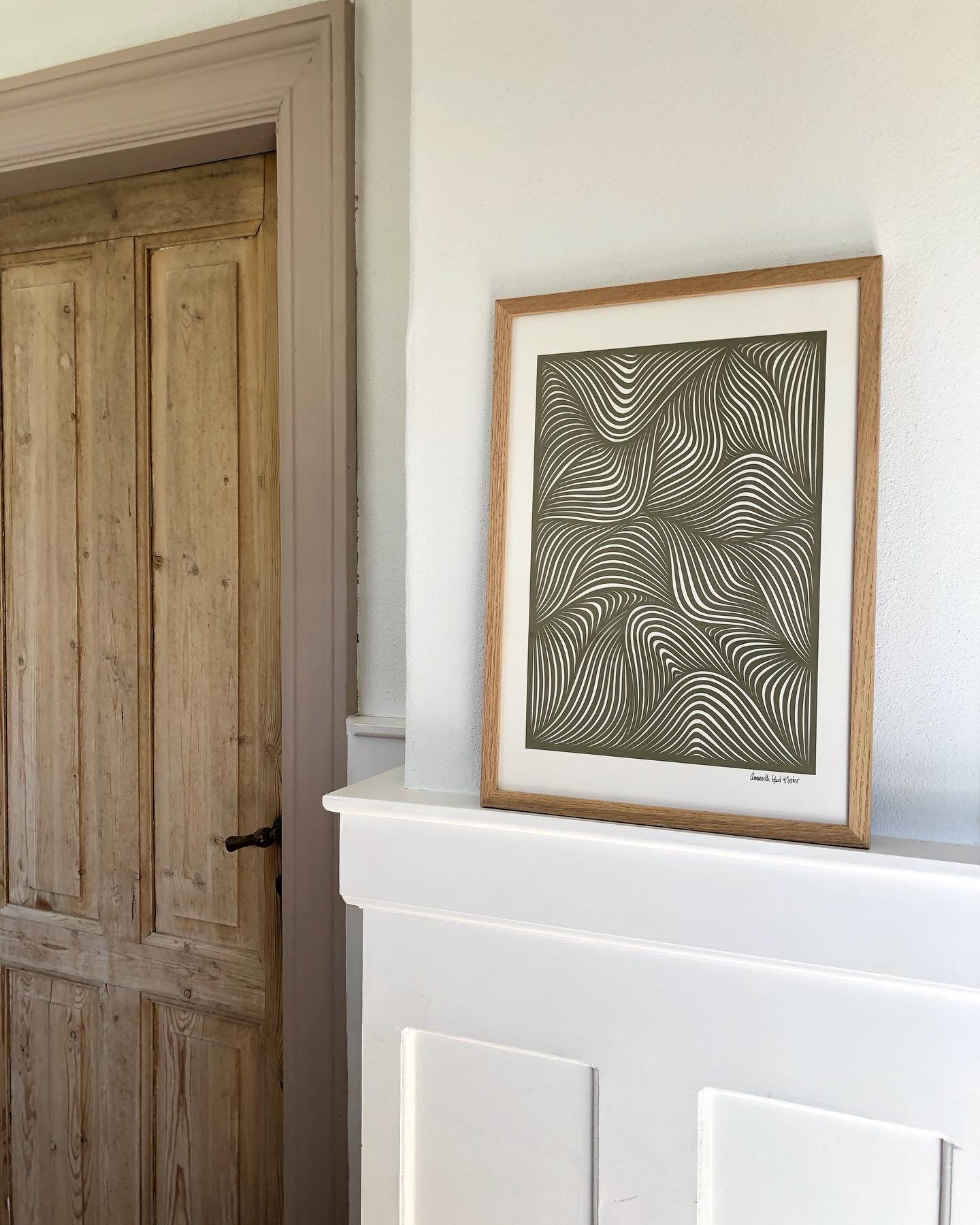 Håndskåret unika papercut i olivengrønt på baggrund i knækket hvid, str. A3 (29,7x42cm).