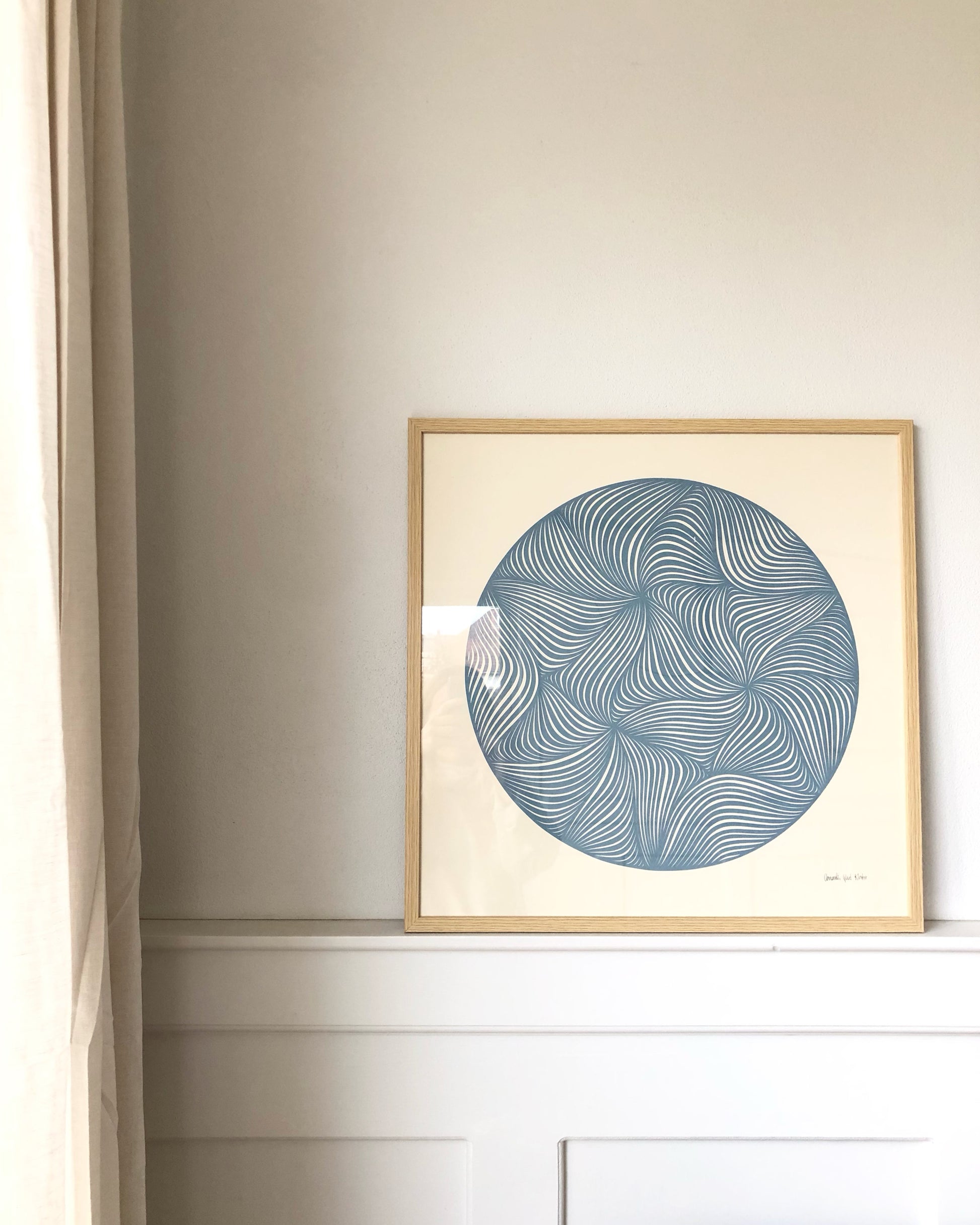 Rund støvet blå udskæring på creme baggrund, 50x50cm.
